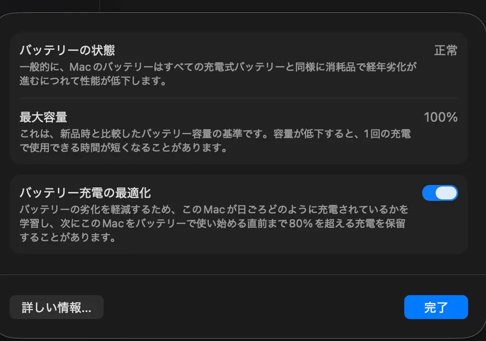 ということで私のMacbookを見てみましょう。設定画面のバッテリーからチェックしてみます。